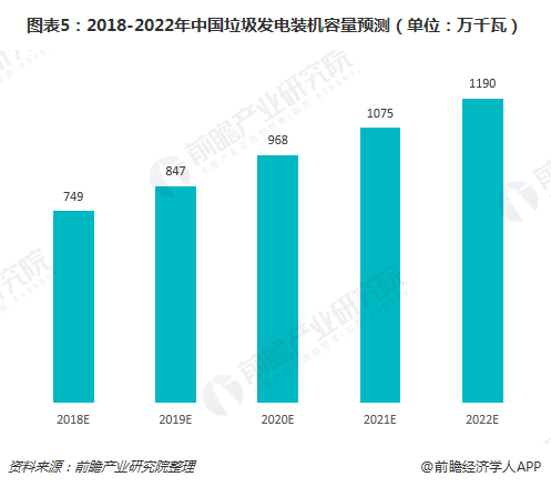 另一方面,垃圾焚燒發(fā)電尚處于快速發(fā)展時期。在此期間,垃圾焚燒發(fā)電行業(yè)進(jìn)入可持續(xù)現(xiàn)代化發(fā)展軌道,大型專業(yè)化企業(yè)引領(lǐng)行業(yè)發(fā)展,行業(yè)集中度逐步提高,形成較大的行業(yè)規(guī)模。根據(jù)預(yù)測,2018-2022年,垃圾發(fā)電裝機(jī)容量年均復(fù)合增長率約為12.27%,預(yù)計(jì)到2022年中國垃圾發(fā)電裝機(jī)容量將達(dá)到1190萬千瓦。