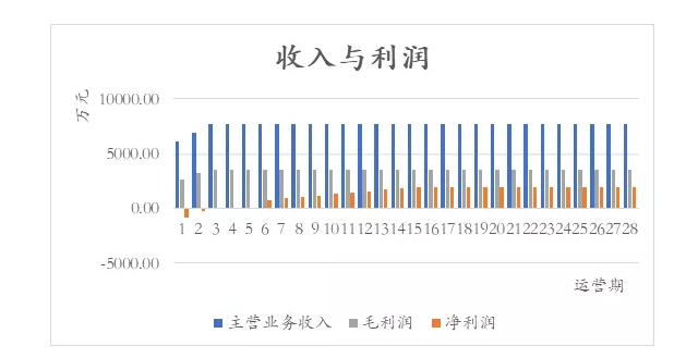 根據(jù)測(cè)算,模擬項(xiàng)目在運(yùn)營(yíng)期第三年進(jìn)入達(dá)產(chǎn)年份,垃圾處理量達(dá)到34.50萬(wàn)噸/年,當(dāng)垃圾處理服務(wù)費(fèi)單價(jià)為70元/噸時(shí),項(xiàng)目公司主營(yíng)業(yè)務(wù)收入每年約7700萬(wàn)元,毛利潤(rùn)約為3500萬(wàn)元/年,整個(gè)運(yùn)營(yíng)期毛利率達(dá)到45%。