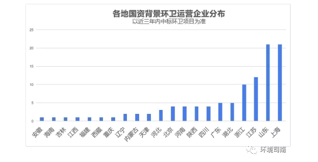 另外,據(jù)環(huán)境司南不完全統(tǒng)計,除了活躍在招投標領(lǐng)域的北京環(huán)境衛(wèi)生工程集團、臨沂環(huán)境衛(wèi)生集團、壽光環(huán)衛(wèi)集團、日照環(huán)衛(wèi)集團等集團化企業(yè)外,近三年來中標環(huán)衛(wèi)項目的各類國資背景環(huán)衛(wèi)運營企業(yè)數(shù)量超過100家,主要集中在華東地區(qū),華東地區(qū)的此類企業(yè)占全國總量的60%以上。