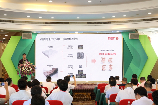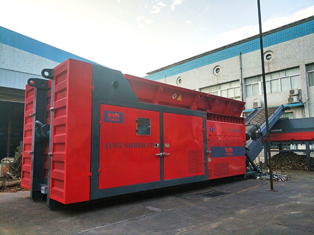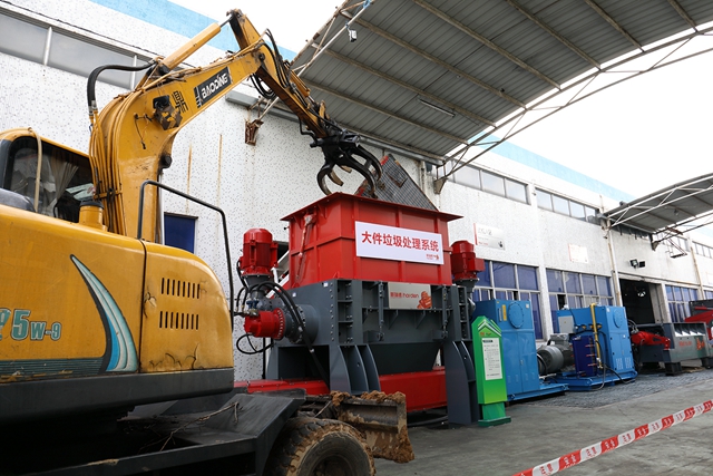 斯瑞德大件生活垃處理設(shè)備“吃進(jìn)”鋼絲床墊、冰箱、油漆桶、自行車(chē),裝著刀片的滾軸,將這些物料切分、撕碎,直至從出料口出來(lái)的是不足20厘米的碎料。