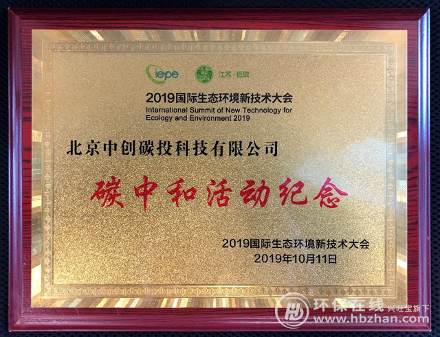 圖為2019國(guó)際生態(tài)環(huán)境新技術(shù)大會(huì) 中創(chuàng)碳投榮獲證書(shū)
