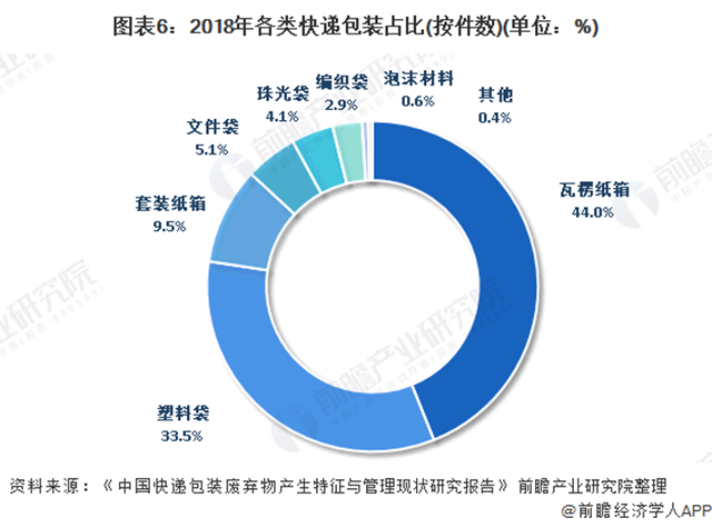 快遞包裝的主要材料包括瓦楞紙箱、塑料袋、膠帶、快遞運單及填充物等。根據(jù)環(huán)保組織綠色和平、擺脫塑縛與中華環(huán)保聯(lián)合會聯(lián)合發(fā)布的《中國快遞包裝廢棄物產(chǎn)生特征與管理現(xiàn)狀研究報告》調(diào)查數(shù)據(jù)顯示,2018年,中國快遞包裝主要以瓦楞紙箱和塑料袋為主。其中瓦楞紙箱占占44.0%(按件數(shù)),塑料袋占33.5%。