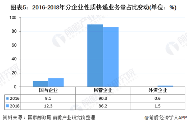 從企業(yè)性質(zhì)來看,近年來民營企業(yè)快遞業(yè)務(wù)量占比有所下滑。2018年,民營企業(yè)快遞業(yè)務(wù)量占總快遞量的86.2%,較2016年下降4.1個百分點。國有企業(yè)及外資企業(yè)快遞業(yè)務(wù)量占比有所上升。
