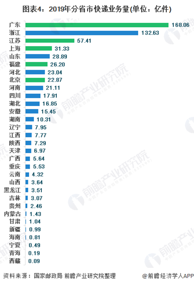 從各省市快遞業(yè)務(wù)量來看,2019年快遞業(yè)務(wù)量前三省市分別為:廣東(168.06億件)、浙江(132.63億件)、江蘇(57.41億件)。