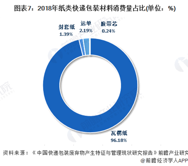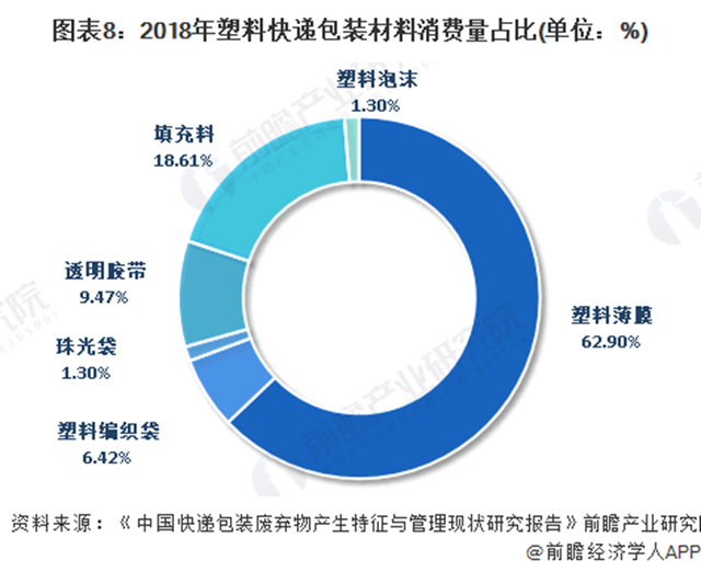 其中紙質(zhì)包裝以瓦楞紙為主,占比高達96.18%;塑料類包裝材料主要包括塑料袋薄膜(不包括珠光袋和填充薄膜塑料)、編織袋、泡沫箱、珠光袋、膠帶和填充塑料等,其中普通塑料袋薄膜占比最高,質(zhì)量占比達62.90%。對于快遞塑料袋薄膜,約占質(zhì)量比例的80%是由廢料再生的,其廢棄物容易造成環(huán)境污染。