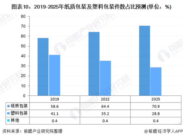 相對于2019年,受禁塑令影響將導(dǎo)致2025年紙質(zhì)包裝快遞潛在需求增加165.9億件,采用可降解塑料的塑料包裝快遞潛在需求增加388.5億件;2025年,用于快遞包裝的瓦楞紙潛在需求增量為459.66萬噸,可降解塑料潛在需求增量為158.78萬噸。