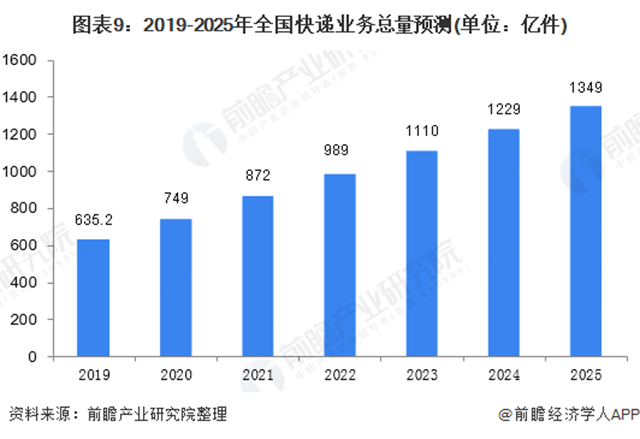 根據(jù)近幾年中國快遞業(yè)務(wù)量增速測算,到2025年,中國快遞業(yè)務(wù)量將達到1349億件,年復(fù)合增長率為13.4%。