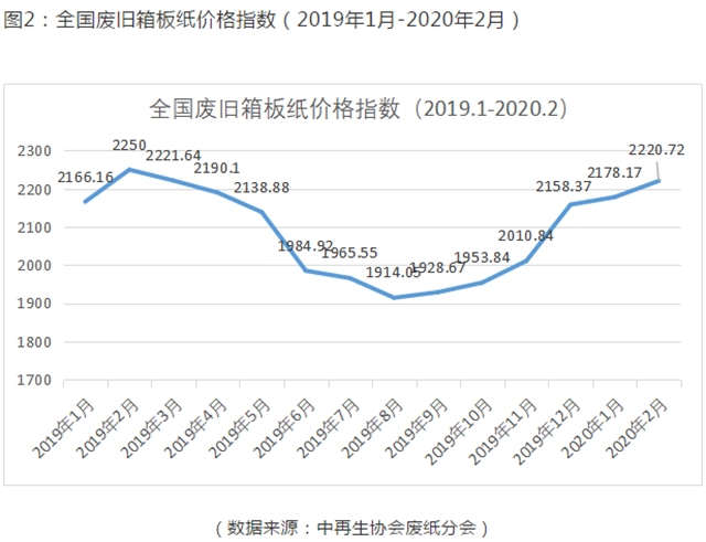 圖1:全國(guó)瓦楞紙平均價(jià)格走勢(shì)(2019年1月-2020年2月)