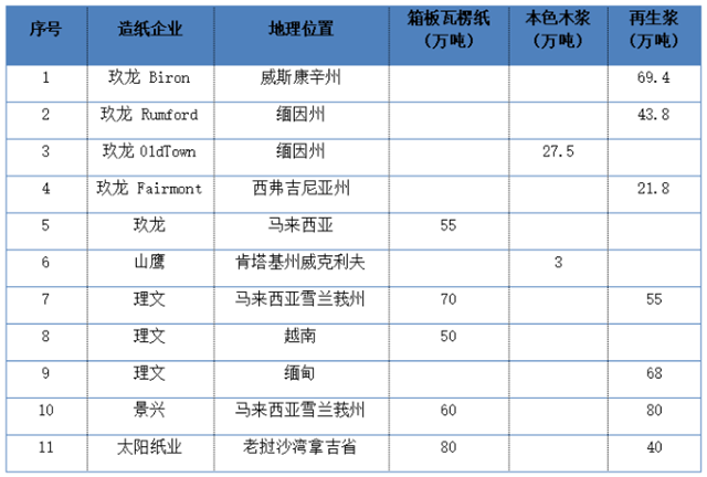 2018年起,中國(guó)政府調(diào)整了廢紙進(jìn)口政策,三年來廢紙進(jìn)口許可證額度持續(xù)以35-40%的幅度在下降,根據(jù)生態(tài)環(huán)境部多次會(huì)議傳達(dá)的精神,極大可能在2021年基本實(shí)現(xiàn)廢紙0進(jìn)口。在中國(guó)大陸以外地區(qū)將廢紙加工成再生漿進(jìn)口中國(guó),成為中國(guó)補(bǔ)充進(jìn)口廢紙缺口的主要方式。中國(guó)大型造紙企業(yè)紛紛在海外通過自建或合作方式布局再生漿產(chǎn)能。這一纖維補(bǔ)充渠道在當(dāng)前國(guó)廢短缺、外廢額度有限的局面下顯得尤為重要。玖龍、理文、山鷹、景興、太陽(yáng)等紙廠均已在海外布局了大規(guī)模再生漿產(chǎn)能。在北美地區(qū),中國(guó)紙廠預(yù)計(jì)新增本色木漿的產(chǎn)能27.5萬噸,再生漿的產(chǎn)能135萬噸。在東南亞地區(qū),中國(guó)紙廠預(yù)計(jì)新增箱板瓦楞紙的產(chǎn)能315萬噸,再生漿的產(chǎn)能243萬噸。