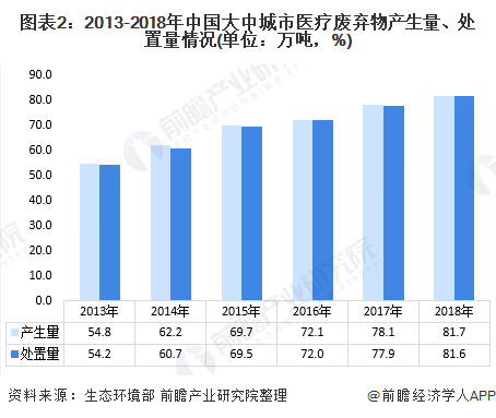 隨著城市化進(jìn)程加快,我國(guó)大中城市醫(yī)療廢棄物產(chǎn)生量與處置量呈逐年上漲態(tài)勢(shì)。2018年,我國(guó)大中城市醫(yī)廢產(chǎn)生量達(dá)81.7萬噸,同比增長(zhǎng)4.61%;處置量達(dá)81.6萬噸,同比增長(zhǎng)4.75%。