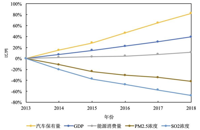 2013–2018年中國GDP、能源消費(fèi)總量、民用汽車保有量和74城市空氣質(zhì)量變化情況