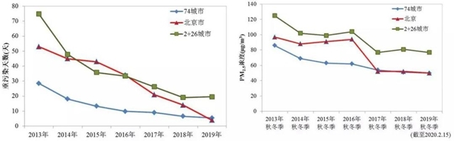 全國74城市、“2+26”城市和北京市重污染天數(shù)和PM2.5濃度變化