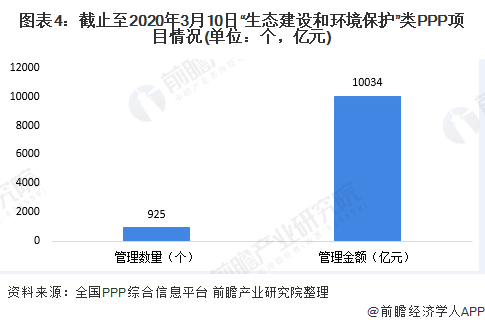 PPP(公私合營)模式是固廢處理項目的主要運(yùn)營模式之一。根據(jù)全國PPP綜合信息平臺項目管理庫數(shù)據(jù)顯示,截止至2020年3月10日,“生態(tài)建設(shè)和環(huán)境保護(hù)”類項目數(shù)量為925個,數(shù)量排名各類項目中第三名;項目金額為1萬億元,排名所有項目中第4名??梢姡ü虖U處理項目在內(nèi)的生態(tài)環(huán)保在PPP項目中依然占據(jù)關(guān)鍵地位。