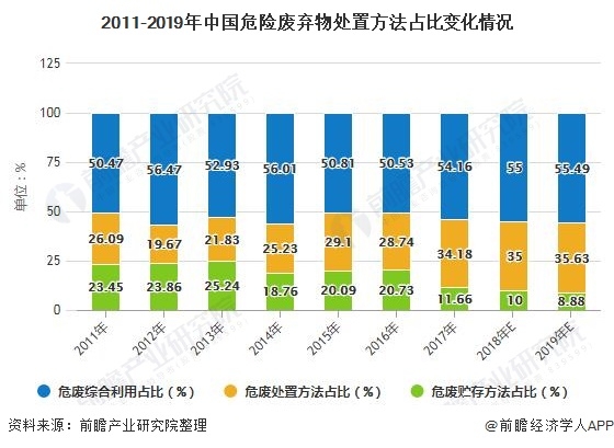 隨著環(huán)保行業(yè)的發(fā)展,我國(guó)危險(xiǎn)廢棄物處置中綜合利用比重越來(lái)越高,由2011年的50.47%溫和上升到2017年的54.16%,前瞻初步估計(jì)2019年,危廢綜合利用占比將達(dá)到55.49%,深度資源化正成為危廢行業(yè)的發(fā)展方向;2015以來(lái)危廢貯存占比逐年下降,初步估計(jì)2019年危廢貯存量占比為8.88%;危廢處置占比也呈現(xiàn)增長(zhǎng)態(tài)勢(shì),初步估計(jì)2019年危廢處置方法占比達(dá)到35.63%。
