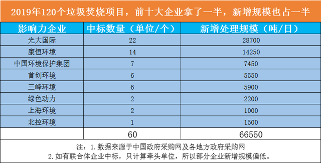 以垃圾焚燒為例,《環(huán)保圈》曾經做過統(tǒng)計,在2019年釋放的120個垃圾焚燒項目中,光大國際、康恒環(huán)境、中國環(huán)境保護、首創(chuàng)環(huán)境等業(yè)內“十大影響力企業(yè)”就累計中標60座垃圾焚燒項目,占全國新增項目的50%。日處理規(guī)模高達66550噸,約占全國新增處理規(guī)模的52%(如圖二所示)。(詳情點擊:解析2019全國垃圾焚燒市場“動向”)
