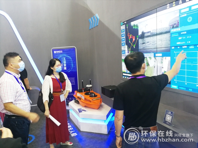 圖為展會(huì)現(xiàn)場(chǎng)相關(guān)工作人員介紹河湖監(jiān)管巡查無(wú)人船及水質(zhì)監(jiān)測(cè)無(wú)人船應(yīng)用平臺(tái)