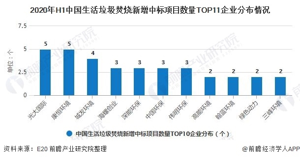 在企業(yè)競(jìng)爭(zhēng)格局方面,2020年上半年,光大國(guó)際和康恒環(huán)境中標(biāo)的垃圾焚燒項(xiàng)目數(shù)量最多,均中標(biāo)了5個(gè)項(xiàng)目;其次是城發(fā)環(huán)境,中標(biāo)項(xiàng)目達(dá)4個(gè)。