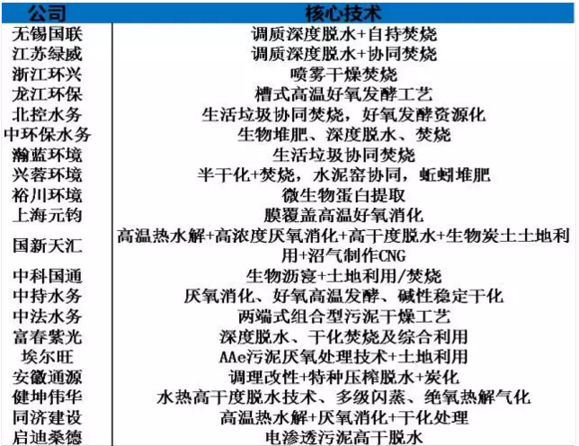 污泥行業(yè)中主要公司的處理核心技術統(tǒng)計表