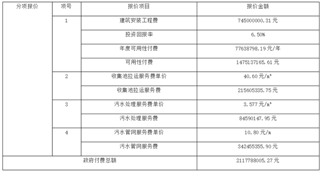 雙方合作期限20年,建設(shè)期1年、運營期19年。采用建設(shè)-運營-移交(BOT)的操作模式,于合作期滿后,由項目公司將項目資產(chǎn)無償移交給政府或其他政府指定機(jī)構(gòu)。預(yù)中標(biāo)項目投資90404萬元,政府付費2117788005.27元。
