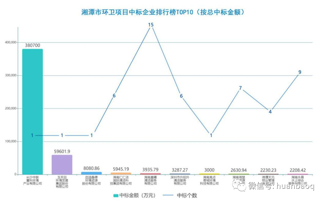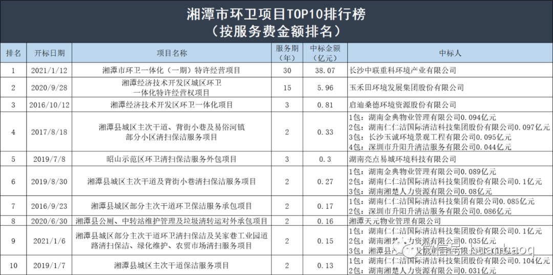 不過,換個角度,如果從中標(biāo)金額看,盈峰中聯(lián)則是最大的勝利者,雖然只中標(biāo)一個項目,但是服務(wù)費高達(dá)38.07億元,位列第一;第二和第三分別為玉禾田和啟迪桑德環(huán)境,中標(biāo)金額分別為59601.9萬元和8080.86萬元,其實這兩家公司也僅僅中標(biāo)了一個項目。? 首先值得注意的是本地“巨鱷”——長沙中聯(lián)重科環(huán)境產(chǎn)業(yè)有限公司。剛剛過去的8月21日,盈峰中聯(lián)發(fā)布了2021年半年度報告,營收54.48億元,歸母凈利潤3.71億元。報告期內(nèi),公司環(huán)衛(wèi)服務(wù)營業(yè)收入實現(xiàn)13.53億元,同比增長68.64%,成功突破廣州、蘇州、武漢、中山、三亞等15個地級市首次落地環(huán)衛(wèi)服務(wù)項目,市場開拓能力顯著。在湖南本地環(huán)衛(wèi)市場上,該公司今年也斬獲了多個億級項目:·2021年1月12日,中標(biāo)湘潭市環(huán)衛(wèi)一體化(一期)特許經(jīng)營項目,項目特許經(jīng)營期限30年,總服務(wù)費約為38.07億元;·2021年5月31日,中標(biāo)邵陽市新寧縣城鄉(xiāng)環(huán)衛(wèi)一體化項目特許經(jīng)營項目,合計投標(biāo)總價4.81億元,服務(wù)期15年(含建設(shè)期1年);·2021年7月19日,中標(biāo)湘西土家族苗族自治州鳳凰縣城鄉(xiāng)生活垃圾收轉(zhuǎn)運一體化服務(wù)采購項目,服務(wù)期限8年,總服務(wù)金額約為2.14億;中標(biāo)價231元/噸,項目日轉(zhuǎn)運規(guī)模317.62噸(保底量設(shè)定為300噸/天,超出部分據(jù)實結(jié)算)。鑒于盈峰中聯(lián)在行業(yè)內(nèi)的強悍實力和湖南本土企業(yè)的地區(qū)優(yōu)勢,筆者預(yù)測未來很長時間內(nèi),他將持續(xù)稱霸湘潭市環(huán)衛(wèi)市場。根據(jù)2021年上半年年報,玉禾田營業(yè)收入約23.98億元,同比增長16.61%。此項數(shù)據(jù)已經(jīng)超過了該企業(yè)去年全年營收的一半。在湖南省環(huán)衛(wèi)市場上,玉禾田也有一定的收獲,中標(biāo)的湘潭市項目是該地區(qū)唯二的億級環(huán)衛(wèi)項目:·2020年9月28日,中標(biāo)湘潭經(jīng)濟技術(shù)開發(fā)區(qū)城區(qū)環(huán)衛(wèi)一體化特許經(jīng)營權(quán)項目,服務(wù)期15年,服務(wù)費5.96億元。·2021年4月21日,中標(biāo)株洲市蘆淞區(qū)環(huán)衛(wèi)服務(wù)項目,中標(biāo)金額為1.35億元,服務(wù)期3年。本項目分為9個包組,玉禾田中標(biāo)包2,服務(wù)費3217.33萬元。作為一個外地企業(yè),玉禾田已經(jīng)在湖南省內(nèi)成功打開了局面,期待他有更好的表現(xiàn)。? 排名第三的是啟迪桑德環(huán)境資源股份有限公司。對湘潭市環(huán)衛(wèi)市場而言,啟迪環(huán)境入局時間很早。2016年10月12日,啟迪桑德環(huán)境中標(biāo)湘潭經(jīng)濟技術(shù)開發(fā)區(qū)環(huán)衛(wèi)一體化項目,但此后,就再也未能見到該企業(yè)中標(biāo)湘潭市環(huán)衛(wèi)項目的信息。近年來,啟迪環(huán)境常被負(fù)面信息纏身。根據(jù)啟迪環(huán)境2021年上半年業(yè)績預(yù)告,預(yù)計2021年上半年虧損33億元至40億元,相較于上年同期的盈利1.81億元,同比大降1927%—2315%。對啟迪環(huán)境來說,解決財務(wù)問題的最大的轉(zhuǎn)機或許是1月11日城發(fā)環(huán)境發(fā)布的擬換股吸收合并事件。啟迪環(huán)境是否能通過和城發(fā)“聯(lián)姻”緩解資金鏈危機?此次行業(yè)矚目的合作是否能有“實錘”?我們將拭目以待。此外,榜單中的湖南仁仁潔國際清潔科技集團有限公司、湖南晨曦清潔服務(wù)有限公司、湖南亮點易城環(huán)境科技有限公司均為湖南本地環(huán)衛(wèi)企業(yè)。湖南湘楚人力資源有限公司、湘潭天元物業(yè)管理有限公司都屬于非環(huán)衛(wèi)企業(yè),湖南永昌水上綜合服務(wù)有限公司則屬于水上運輸服務(wù)業(yè)。另外一點值得注意的是,目前榜首的10家企業(yè)均為私企,顯示地方國企在湘潭市環(huán)衛(wèi)市場上明顯發(fā)力不足。