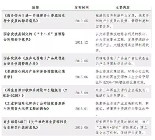 2015年7月,國務(wù)院發(fā)布《國務(wù)院關(guān)于積極推進(jìn)“互聯(lián)網(wǎng)+”行動(dòng)的指導(dǎo)意見》,引導(dǎo)再生資源回收行業(yè)向信息化、自動(dòng)化、智能化方向發(fā)展,促進(jìn)再生資源交易透明化、便利化。2016年5月,商務(wù)部等國家六部委印發(fā)了《關(guān)于推進(jìn)再生資源回收行業(yè)轉(zhuǎn)型升級(jí)的意見》。強(qiáng)調(diào)推廣“互聯(lián)網(wǎng)+回收”的新模式;建立完善各項(xiàng)機(jī)制,促進(jìn)行業(yè)發(fā)展。