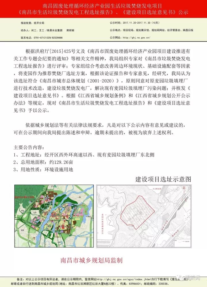 目前,《南昌市生活垃圾焚燒發(fā)電工程選址報告》和《建設(shè)項目選址意見書》已對外公示。凡對公示內(nèi)容有意見或建議的,可在公示期間向南昌市城鄉(xiāng)規(guī)劃局提出陳述和申辯,公示時間11月20日-30日,聯(lián)系電話0791-87121329/82329666。