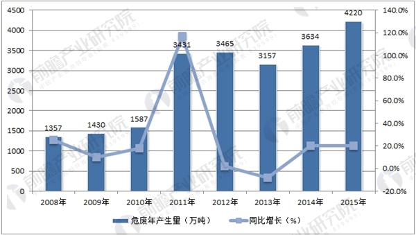 根據(jù)前瞻產(chǎn)業(yè)研究院發(fā)布的《危廢處理行業(yè)市場前瞻與投資分析報(bào)告》統(tǒng)計(jì)數(shù)據(jù),2015年全國危險(xiǎn)廢物產(chǎn)生量達(dá)4220萬噸,較2014年增長16%。危廢產(chǎn)生量仍呈現(xiàn)不斷上升趨勢。從發(fā)達(dá)國家的經(jīng)驗(yàn)來看,危險(xiǎn)廢物產(chǎn)生量為固體廢物的3%左右。我國近幾年工業(yè)固廢產(chǎn)量在30億噸左右,估算當(dāng)前危險(xiǎn)廢物的實(shí)際產(chǎn)量達(dá)6000-10000萬噸。