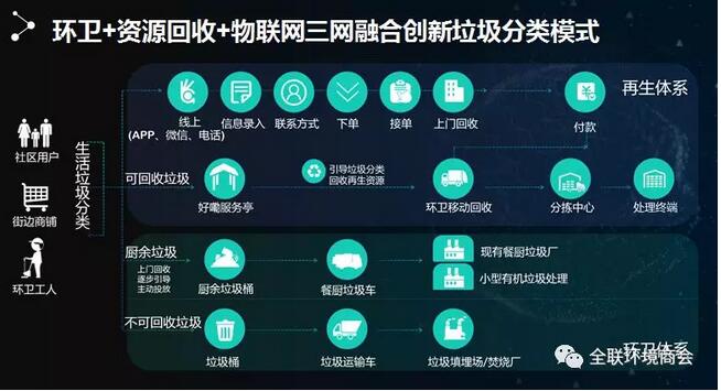 在硬件端,桑德環(huán)衛(wèi)有環(huán)衛(wèi)車、環(huán)衛(wèi)工人,還有一種與社區(qū)垃圾分類連接的“好嘞亭”。再加上再生資源回收系統(tǒng),使它們都與環(huán)衛(wèi)連接在一起,運用互聯(lián)網(wǎng)、物聯(lián)網(wǎng)和云計算,形成一個信息互聯(lián)互通的網(wǎng)絡(luò)。