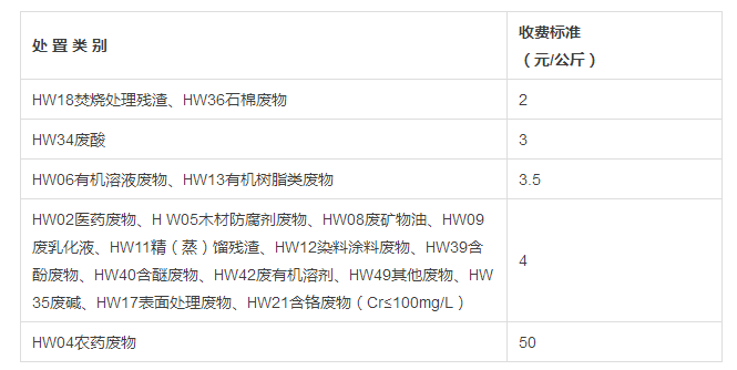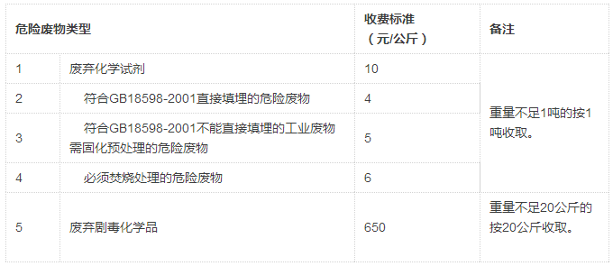 (二)其它危險(xiǎn)廢物處置。對(duì)其它危險(xiǎn)廢物,按產(chǎn)生的廢物重量收取處置費(fèi),具體收費(fèi)標(biāo)準(zhǔn)(不含稅):
