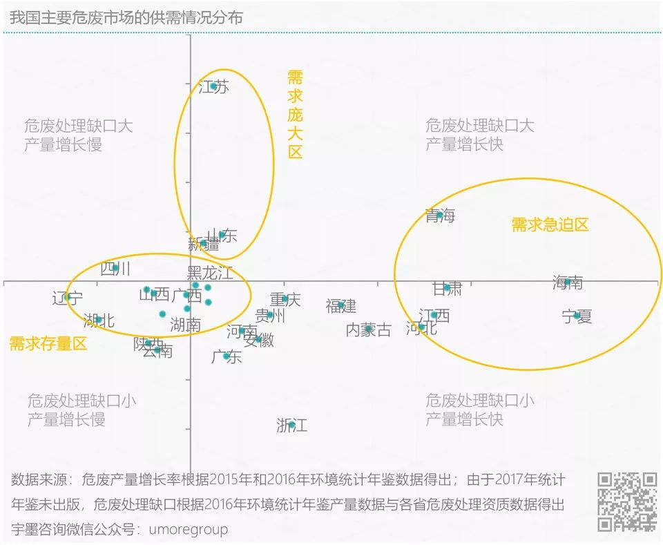 如果將我國主要省份的危廢產(chǎn)量增長率和市場缺口進行統(tǒng)計整理,可以發(fā)現(xiàn)有三個區(qū)域值得關(guān)注。其一,是以青海、海南為代表的需求急迫區(qū)。在這個區(qū)域中,各省的危廢產(chǎn)量增長率均超過50%,而這些地區(qū)對危廢的處理能力也幾乎達到飽和。這樣高增量且將要出現(xiàn)能力缺口的省份最需要的是提升整體的能力,因此,對于新的中小型企業(yè)而言,切入快速擴張的市場并從中分得一杯羹將是很好的機會。