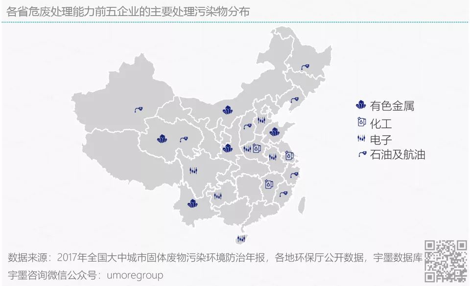 而由于產(chǎn)業(yè)聚集,也存在相應(yīng)的問題,那就是各地的污染物也有著明顯的區(qū)別,無法簡單地用統(tǒng)一標準進行合理處置。因此長期以來,我國的危廢行業(yè)都有著區(qū)域壁壘高的特點,且隨著國家對于跨省運輸危廢要求的提高,這種區(qū)域性就更為明顯。如果我們把各省份危廢處理資質(zhì)的Top5列出來,也可以發(fā)現(xiàn)幾乎每個省份的主要危廢龍頭所從事的領(lǐng)域都與當?shù)氐漠a(chǎn)業(yè)特點相呼應(yīng),這也進一步驗證了危廢處置存在明顯的區(qū)域性。