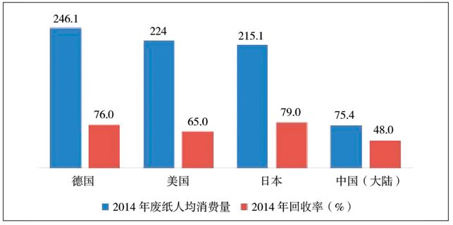 圖22014年中國(guó)內(nèi)地人均紙年消費(fèi)量及廢紙回收率比較