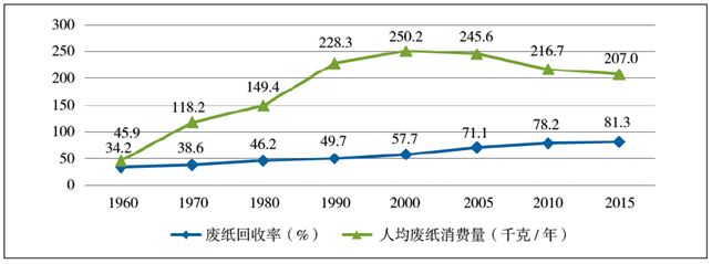 圖31960~2015年日本人均紙年消費(fèi)量及廢紙回收率