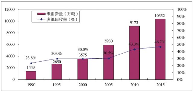 圖61990~2015年內(nèi)地紙消費(fèi)量以及廢紙回收率