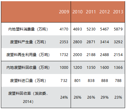 廢塑料是生活垃圾可回收物中增長(zhǎng)最快的部分。根據(jù)《中國(guó)資源綜合利用年度報(bào)告(2014),國(guó)家發(fā)展改革委員會(huì)》公布的數(shù)據(jù)(見(jiàn)下表),2009~2013年我國(guó)廢塑料回收利用率為23%~29%。