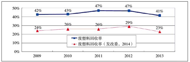 圖72009~2013年內(nèi)地廢塑料回收率兩種計(jì)算結(jié)果