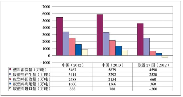 圖9中國(guó)內(nèi)地與歐盟廢塑料回收利用量對(duì)比