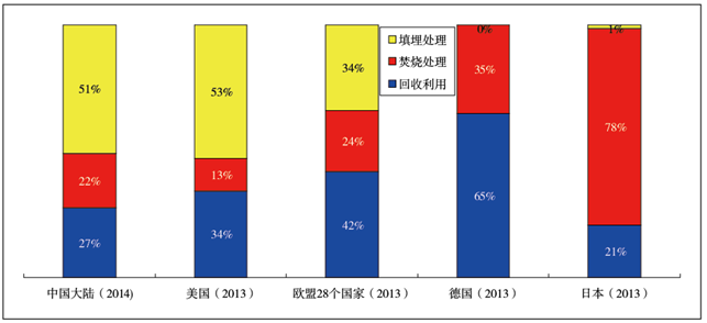 圖13中國(guó)大陸生活垃圾回收利用率與主要發(fā)達(dá)國(guó)家和地區(qū)對(duì)比