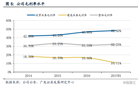 另外一個就是財務(wù)準則的改變。在中國內(nèi)陸的財務(wù)準則下,建設(shè)收益是不計入營收的,所以更改后2016年的營收與凈利潤分別下降約約65%和35%,但是公司基本面不變。由于建設(shè)收入不計入收入,而建設(shè)業(yè)務(wù)的毛利率較運營業(yè)務(wù)低,拉低了公司整體毛利率水平,調(diào)整后公司的毛利率將由32%上升至64.9%。