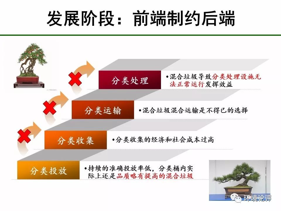我國2000年開始在8個(gè)試點(diǎn)城市開始推行垃圾分類,總體而言進(jìn)展緩慢,收效甚微,飽受社會(huì)質(zhì)疑與批評(píng),其中一個(gè)主要原因就是尚未建成現(xiàn)代化、多樣化的垃圾處理設(shè)施,即使居民做到了源頭分類,環(huán)衛(wèi)企業(yè)也做不到分類收集和分類運(yùn)輸,最終只能“殊途同歸”,進(jìn)入垃圾填埋場。部分小區(qū)采取各種激勵(lì)和監(jiān)督措施后形成的一些示范案例,盡管在營造氛圍、培養(yǎng)習(xí)慣和方便拾荒者方面有一定意義,但歸根到底只是一些點(diǎn)綴性的盆景,尚未形成園林,遑論森林。這一階段是垃圾分類的起步階段,其基本特點(diǎn)是“后端決定前端”,即后端分類處理設(shè)施的缺乏,決定了前端分類收集徒具形式,“混收混運(yùn)”廣受詬病,但客觀上難以避免。