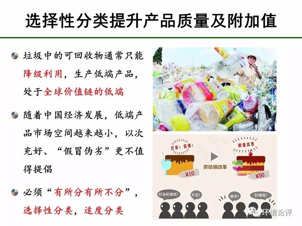 我國當(dāng)前大力推行的供給側(cè)結(jié)構(gòu)性改革實(shí)際上大大提升了垃圾分類產(chǎn)物回收利用的準(zhǔn)入門檻,常態(tài)化的嚴(yán)格環(huán)保督查與“洋垃圾”入境禁令又大大壓縮了“散、亂、污”再生資源回收企業(yè)的生存與發(fā)展空間,“高質(zhì)量發(fā)展”也意味著過去量大質(zhì)次、薄利多銷的低端再生產(chǎn)品將逐步退出歷史舞臺(tái)??梢灶A(yù)期,短時(shí)間之內(nèi)我國生活垃圾源頭分類的準(zhǔn)確性不可能很高,現(xiàn)階段追求“量大”,其后果往往是一堆垃圾勉強(qiáng)分成組分略有差異的幾堆垃圾,以其為原料只能生產(chǎn)大量低端再生產(chǎn)品,而且要付出較高的經(jīng)濟(jì)成本或環(huán)境代價(jià)。低端再生產(chǎn)品市場空間越來越小,反過來又對(duì)垃圾源頭分類造成沖擊。因此,現(xiàn)階段推行垃圾分類,應(yīng)著眼于居民分類習(xí)慣的真正養(yǎng)成與生態(tài)環(huán)境質(zhì)量的整體改善,采取選擇性分類策略,更加注重分出產(chǎn)物的“質(zhì)精”而非“量大”。有了“質(zhì)精”的分類產(chǎn)物,才可能有高質(zhì)量的再生產(chǎn)品,才能有效切斷“散、亂、污”企業(yè)的原料供給,促進(jìn)再生資源回收行業(yè)轉(zhuǎn)型升級(jí),實(shí)現(xiàn)“高質(zhì)量發(fā)展”。