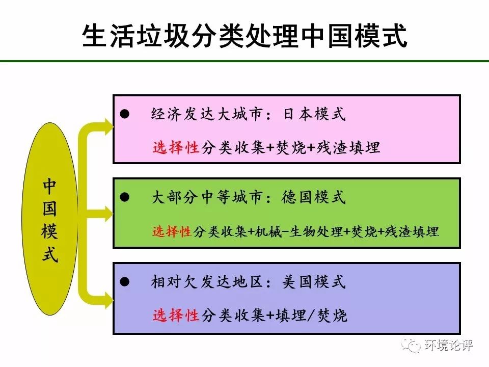 我國經(jīng)濟(jì)社會(huì)發(fā)展不平衡的問題還十分突出,不同區(qū)域自然條件也存在巨大差異,這就決定了我國生活垃圾分類處理必須對(duì)癥下藥,因地制宜。在選擇性分類收集,即將垃圾中特別有用、特別有害、特別有干擾的組分在源頭分出來的基礎(chǔ)上,土地稀缺、人口密集、經(jīng)濟(jì)發(fā)達(dá)的大城市可以采取焚燒發(fā)電為主的處理方式,土地相對(duì)豐富、人口較為稀疏、經(jīng)濟(jì)相對(duì)欠發(fā)達(dá)的地區(qū)可以采取填埋為主焚燒為輔的處理方式,大部分中等城市可以采用焚燒發(fā)電與生物處理相結(jié)合的處理方式。也就是說,生活垃圾分類處理中國模式不可能是單一模式,而是博采日本、美國、德國之所長的綜合模式。