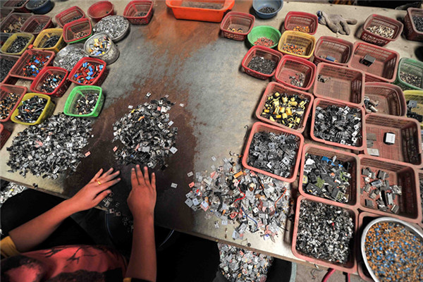上世紀(jì)80年代末,廣東貴嶼鎮(zhèn)開始涉及舊五金電器的拆解生意,由于獲利豐厚,整個(gè)行業(yè)規(guī)模逐漸擴(kuò)大。圖為一名工人正在分揀電子組件(圖:中新社)