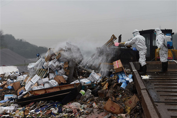 2017年3月29日,在重慶出入境檢驗(yàn)檢疫局監(jiān)督下,總重約30噸的過期、殘次、不合格跨境電子商務(wù)產(chǎn)品集中在重慶黑石子垃圾處理場進(jìn)行無害化銷毀。 圖為工作人員對銷毀產(chǎn)品進(jìn)行無害化處理(圖:中新社)