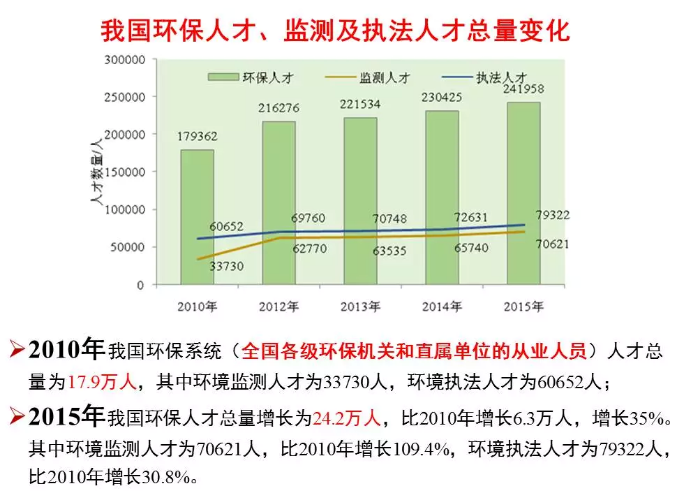 數(shù)據(jù)顯示,2010年我國(guó)環(huán)保系統(tǒng)(全國(guó)各級(jí)環(huán)保機(jī)關(guān)和直屬單位的從業(yè)人員)人才總量為17.9萬(wàn)人,其中環(huán)境監(jiān)測(cè)人才為33730人,環(huán)境執(zhí)法人才為60652人。到2015年,我國(guó)環(huán)保人才總量增長(zhǎng)為24.2萬(wàn)人,比2010年增長(zhǎng)6.3萬(wàn)人,增長(zhǎng)35%。其中環(huán)境監(jiān)測(cè)人才為70621人,比2010年增長(zhǎng)109.4%,環(huán)境執(zhí)法人才為79322人,比2010年增長(zhǎng)30.8%。