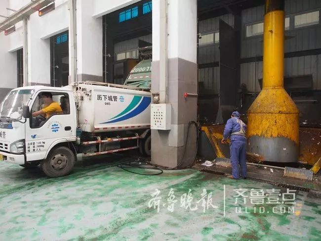 和其他區(qū)建設(shè)有多處中小型轉(zhuǎn)運站不同,歷下投入大量資金建設(shè)的這個全區(qū)唯一轉(zhuǎn)運中心,有著一套先進的中央控制系統(tǒng)。寬敞的卸料車間內(nèi),與想象中充滿惡臭的氣味、臟水橫流的場面截然不同,5名工作人員不間斷對地面進行清掃、沖洗,車間的屋頂上噴灑著生物試劑,這種試劑抑制氣味的同時還有一定的殺菌作用。