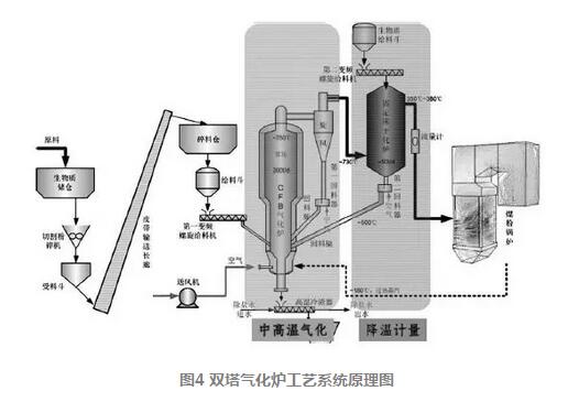 當(dāng)不需換熱器為外部提供生物質(zhì)燃?xì)饨禍禺a(chǎn)生的熱量情況下,生物質(zhì)循環(huán)流化床(CFB)氣化爐可設(shè)計(jì)為雙塔結(jié)構(gòu),即氣化爐+冷卻爐的雙塔工藝,冷卻爐有固定床式和流化床式兩種應(yīng)用方式。雙塔工藝可利用生物質(zhì)燃?xì)饨禍禺a(chǎn)生的熱量加熱人爐生物質(zhì)燃料,在消耗這部分熱能的同時(shí),提高生物質(zhì)氣化爐的熱效率。圖4是雙塔氣化爐工藝系統(tǒng)原理。