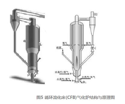 循環(huán)流化床(CFB)氣化爐由下部、上部及尾部三個(gè)部分組成,內(nèi)部設(shè)有耐熱防磨內(nèi)襯。氣化爐結(jié)構(gòu)與原理見(jiàn)圖5。