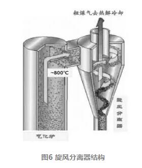 氣化爐尾部主要是氣化爐旋風(fēng)分離器,結(jié)構(gòu)與傳統(tǒng)旋風(fēng)分離器相同,氣化爐旋風(fēng)分離器下部回料返回至氣化爐下部密相區(qū)。分離器內(nèi)部同樣設(shè)有耐溫防磨內(nèi)襯。旋風(fēng)分離器結(jié)構(gòu)見(jiàn)圖6。