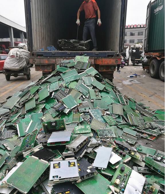 進(jìn)入裝卸場,雜亂無章的金屬碰撞聲便從交易場內(nèi)各個角落傳來。電腦配件一袋袋從集裝箱上扔下,各種電器電路板“嘩啦啦”撒落一地,影碟機(jī)、驗(yàn)鈔機(jī)、錄音機(jī)、電話機(jī)落到地上又彈開,有些廢舊機(jī)器傳出報(bào)警聲,只要電池不拿掉,報(bào)警聲就會一直持續(xù)到電量耗盡為止。